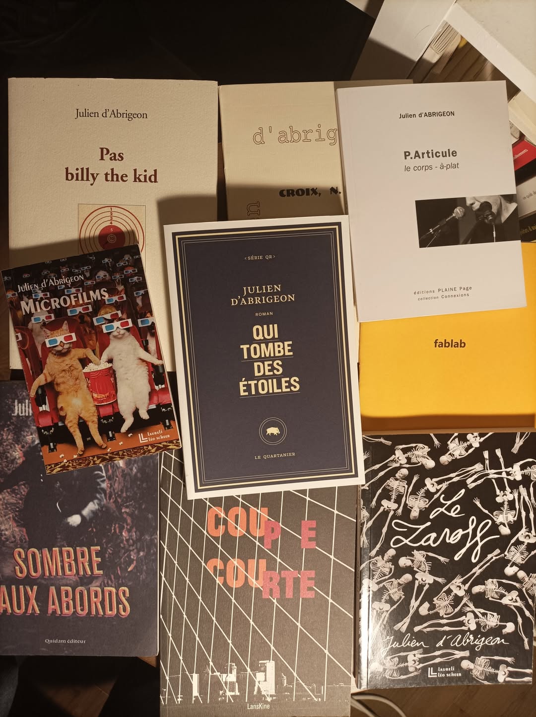Julien d’Abrigeon est né en 1973 à Aubenas, il travaille la prose poétique, la poésie pas en prose, la poésie action et la lecture publique qui pulse un peu partout en France, en Suisse, au Liban, en Uruguay, au Canada… Membre de BoXoN, créateur de tapin², il a publié une dizaine d’ouvrages dont, ces dernières années, Sombre aux abords (Quidam, 2016), Coupe Courte (Lanskine, 2020) et Qui tombe des étoiles (Le Quartanier, 2025, sélection du prix du Médicis et du prix Wepler). Il vit et enseigne dans la Drôme provençale.